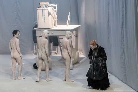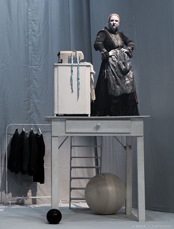 Allo spettacolo “Duramadre” va il merito di spiegare il presente avvalendosi del paradosso, laddove la scrittura scenica risente della necessità di riportare indietro l’orologio della memoria ancestrale, fino a ricondursi al rapporto parentale che si radica in ogni società umana e che qui, in certo modo, si riallaccia a una rilettura del mito di Edipo, così come alla ferocia che spesso soggiace al racconto affabulatorio. In palcoscenico una madre, una ferale matriarca che si contrappone all’inerme nudità dei suoi figli maschi.