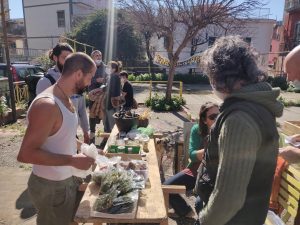 Ogni partecipante ha suddiviso i semi in piccole quantità a casa e li ha racchiusi in barattoli, in pezzetti di carta o in svariati contenitori su cui c’era scritto il nome della pianta, la varietà e altre informazioni rilevanti. Si poteva scambiare il seme con un altro, oppure più semi con uno solo, anche solo offrirli oppure solo prenderli per chi stava iniziando un orto. La voglia di condivisione è alla base di questa iniziativa organizzata dall’associazione Corto Circuito Flegreo, promotrice di servizi per lo sviluppo del distretto di economia solidale nell’area flegrea, con la partecipazione dell’associazione Terra Masta che si occupa di permacultura, rigenerazione ambientale e rete di sane relazioni sul territorio campano e il Rivo.