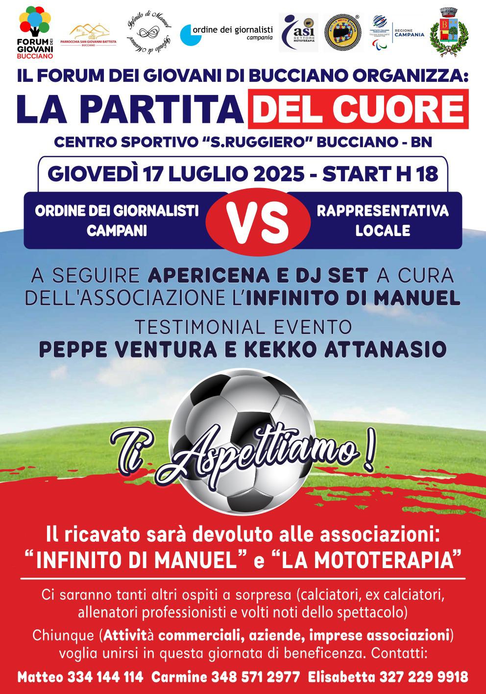 Il Forum dei Giovani di Bucciano, in collaborazione con il Comune di Bucciano, la Parrocchia San Giovanni Battista e le associazioni “Infinito di Manuel” e “La MotoTerapia“, è lieto di annunciare la prima edizione della “Partita del Cuore”, un evento benefico all’insegna dello sport, della solidarietà e della comunità.