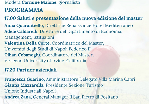 Alla presentazione interverranno Anna Quarantiello, Direttrice del Renaissance Hotel Mediterraneo, Adele Caldarelli, Direttore del Dipartimento di Economia, Management, Istituzioni dell’Università degli Studi di Napoli Federico II, Valentina Della Corte, Coordinatrice del Master e del Corso di Laurea in Hospitality Management dell’Università degli Studi di Napoli Federico II, e Cihan Cobanoglu, Coordinatore del Master, in collegamento dalla Virscend University of Irvine – California. Seguiranno gli interventi dei partner aziendali, tra cui Francesca Guarino, Amministratore Delegato di Villa Marina Capri, Gianna Mazzarella, Presidente Sezione Turismo Unione Industriali Napoli, e Andrea Zana, General Manager de Il San Pietro di Positano. Non da ultimo, ci saranno testimonianze di studenti e diplomati del Master.