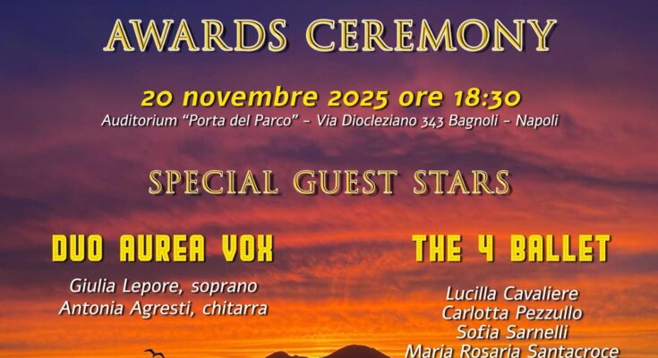 La Cerimonia di Premiazione, presentata da Mariagrazia Paturzo, si terrà il giorno 20 Novembre, sempre presso l’Auditorium Porta del Parco. Sono previste le esibizioni canore del “Duo Aurea Vox”, col soprano Giulia Lepore e la musicista Antonia Agresti, e l’esibizione di danza del “4 Ballet”, con Maria Rosaria Santacroce, Lucilla Cavaliere, Carlotta Pezzullo e Sofia Sarnelli.