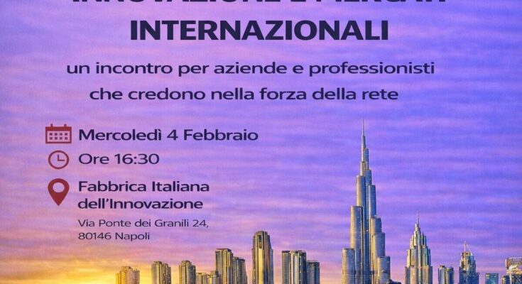 Napoli, 4 febbraio – Networking, sostenibilità e connessioni saranno al centro dell’incontro “Innovazione e Mercati Internazionali”, in programma mercoledì 4 febbraio alle ore 16:30 presso la Fabbrica Italiana dell’Innovazione, in via Ponte dei Granili 24, Napoli.